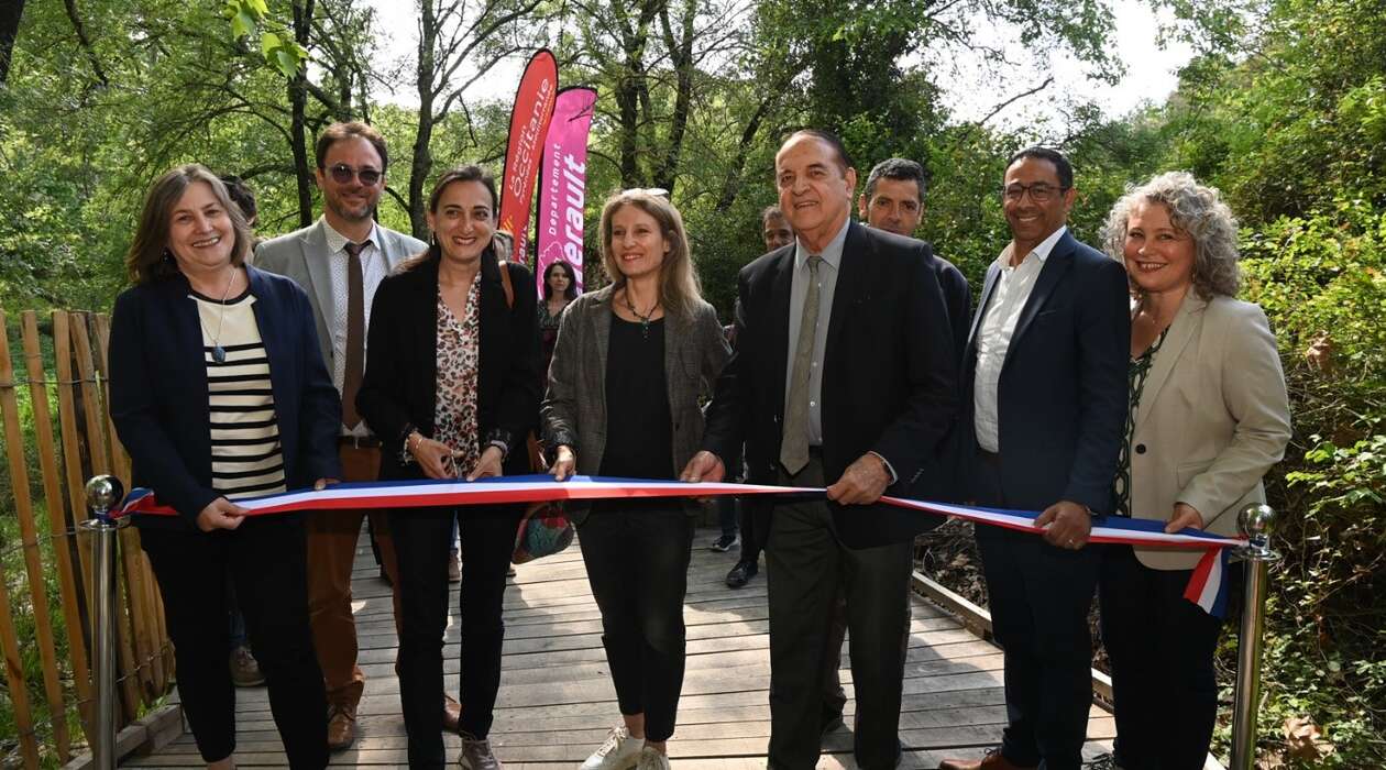 Le Président du Département Kléber Mesquida a inauguré la nouvelle passerelle qui franchit le Lez sans déranger l’habitat d’espèces rares, au domaine du Département Restinclières, à Prades-le-Lez.